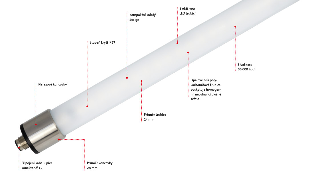 ?ada svítidel TUBE poskytuje efektivní osvětlení stroj? a za?ízení, s konektory M12 pro standardizované p?ipojení.