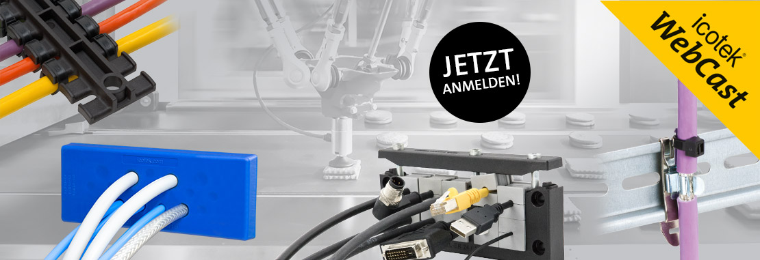 Mit den universellen icotek Systemen zur Kabelführung lassen sich Kabel, Leitungen und Schl?uche schnell, sicher und sauber verlegen und gleichzeitig gegen Zug entlasten. Und das sowohl bei statischer als auch bei dynamischer Beanspruchung. Die Einsatzm?glichkeiten reichen vom Verlegen von Leitungen an Maschinen, Schaltschr?nken und Geh?usen bis hin zu Energieführungsketten. Durch verschiedene Montagem?glichkeiten z. B. für die Hutschiene, C-Schiene oder zur Direktmontage bieten sich vielf?ltige Einsatzm?glichkeiten. Die Montage der Leitungen erfolgt durch handelsübliche Kabelbinder. Hinterschneidungen am kammartigen Profil verhindern ein Herausrutschen der Kabelbinder und erm?glichen einen sicheren Halt. Au?erdem stellen wir Ihnen die CONFiX? Schlauchdurchführungen vor, mit welchen sich in Schutzschl?uchen geführte Leitungen sicher und einfach in Maschinen, Steuerpulte oder Schaltschr?nke einführen lassen.