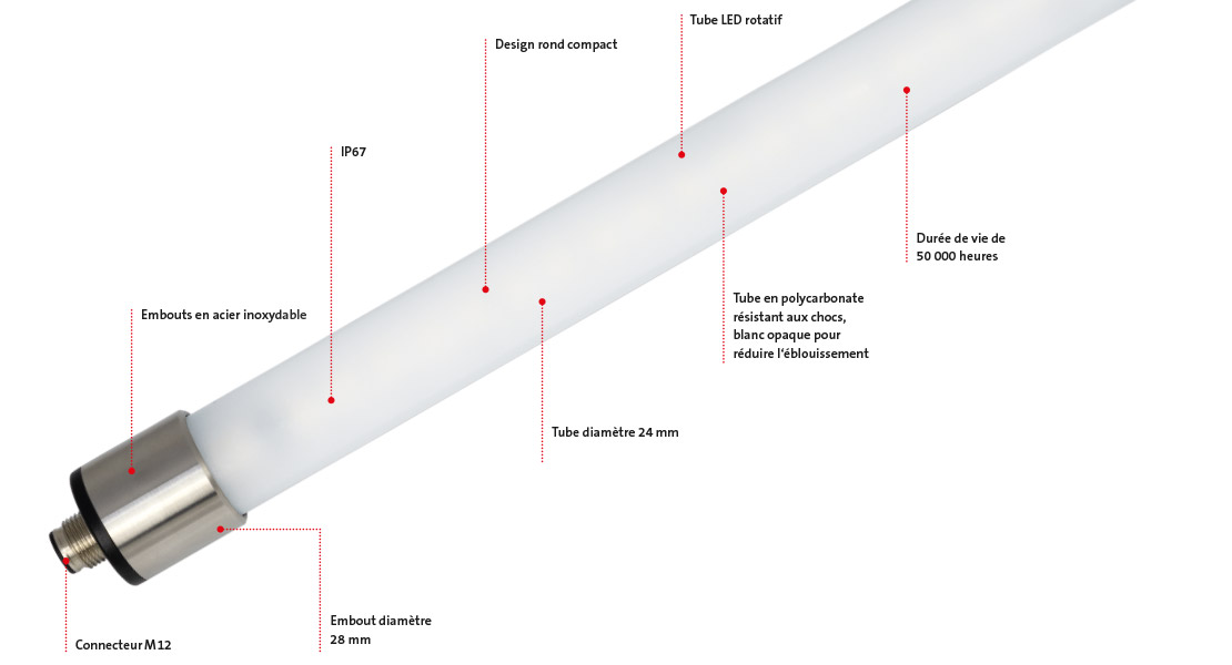 Le luminaire TUBE fournit un éclairage efficace pour les machines et les équipements. Avec des connecteurs M12 il bénéficie d‘une connexion standardisée.