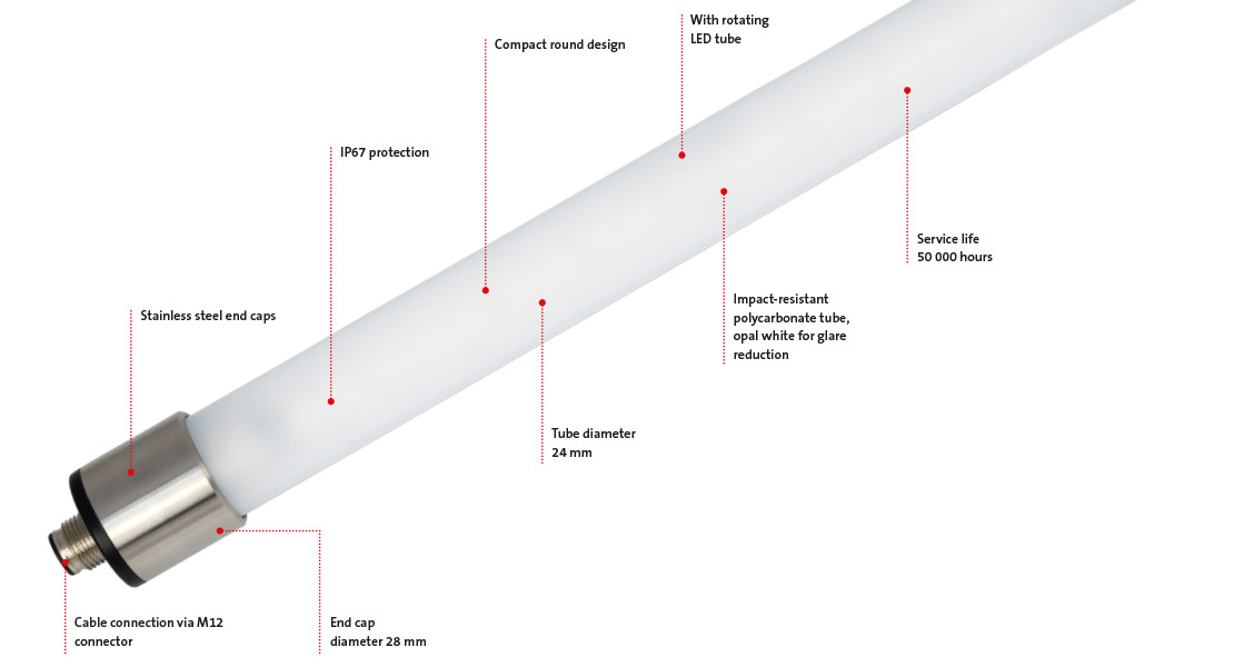 Oprawa systemowa TUBE zapewnia efektywne o?wietlenie maszyn i urz?dzeń, wyposa?ona w z??cza M12 do znormalizowanego pod??czenia.
