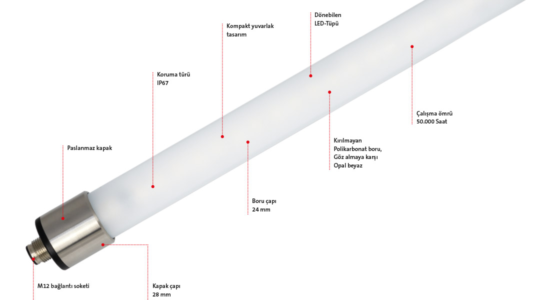 TUBE sistem armatürleri, makineler ve hatlar i?in etkili ayd?nlatma sa?lar ve M12 konekt?rlü ba?lant? sistemi ile standartt? sa?lamaktad?r.